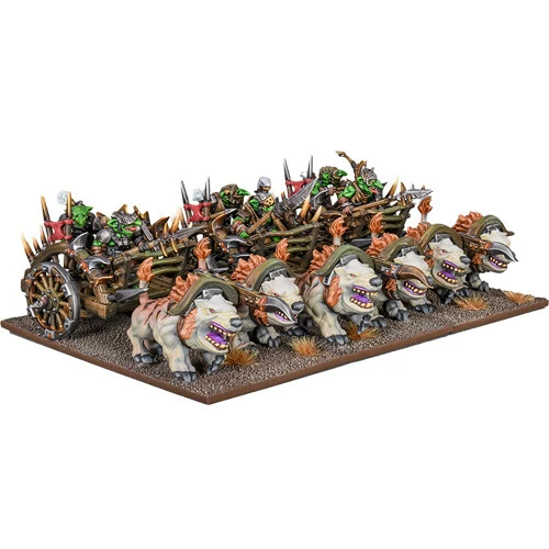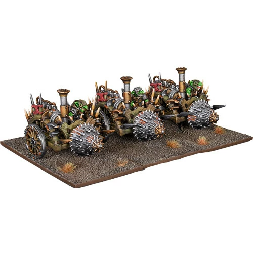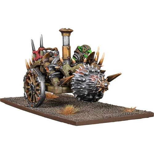 Although hastily and clumsily built, Goblins’ contraptions are not to be underestimated. When yoked to a pair of ferocious mawbeasts a goblin chariot acts as an ideal skirmisher, harrying foes with bow fire and snapping teeth for any who get too close. Mincers on the other hand, are little more than a sets of whirring blades and drills, forced into enemy lines on a temperamental steam engine.